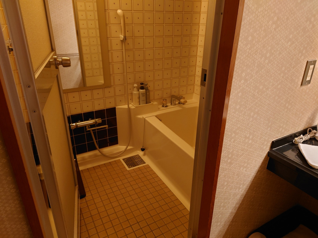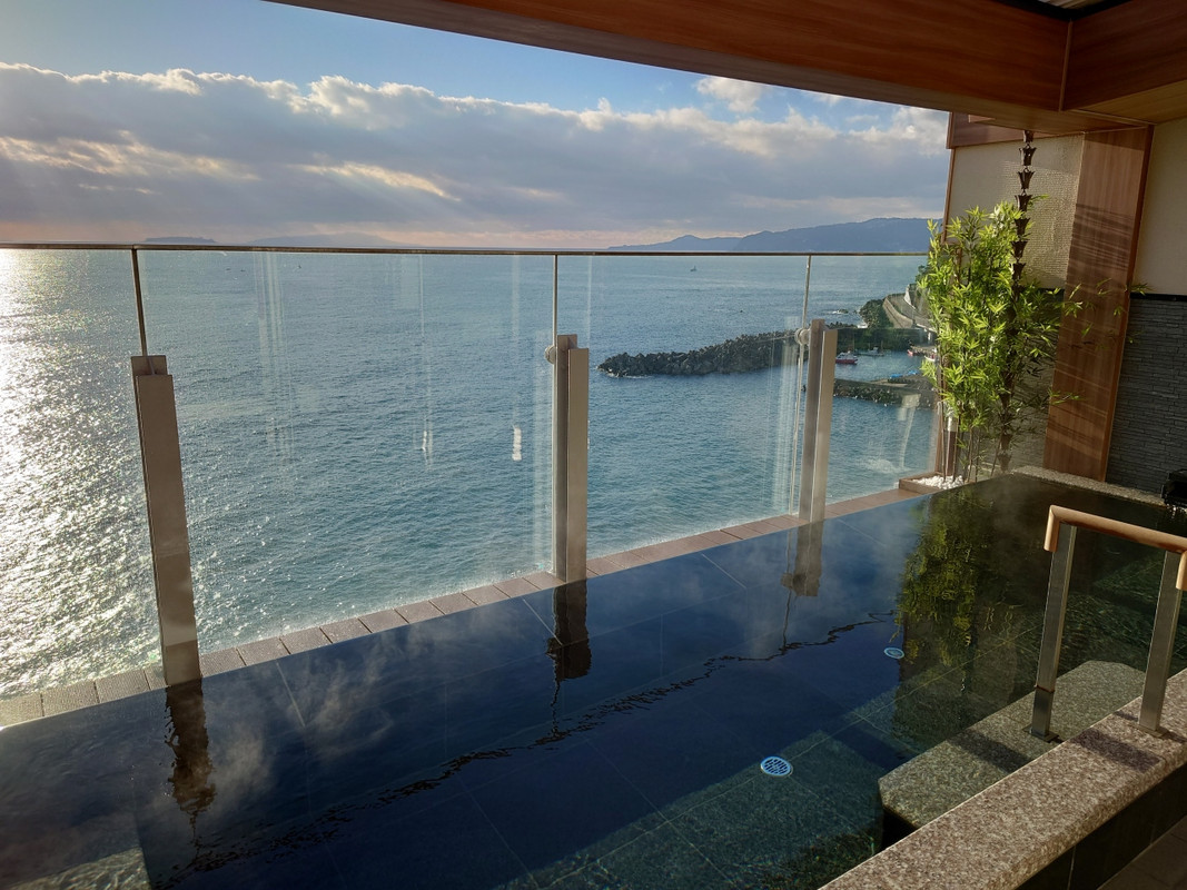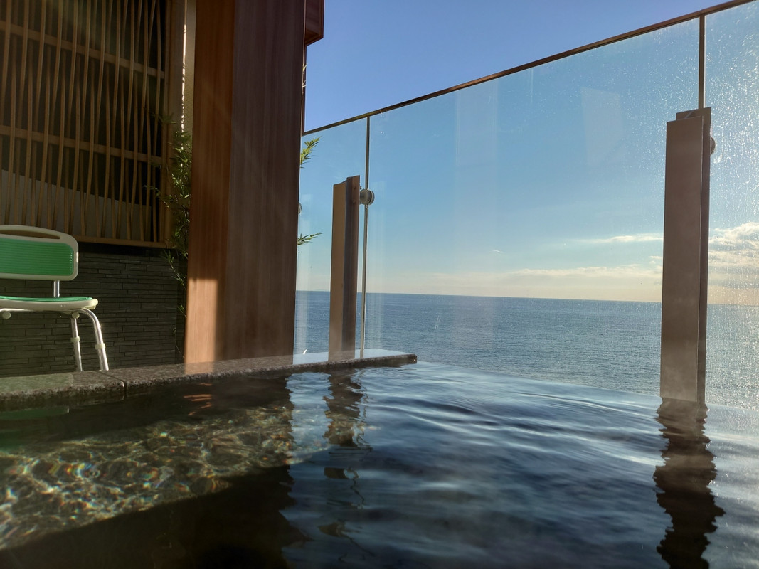 温泉は1Fの大浴場と最上階の展望風呂があり、どちらも広くはないが水平線が