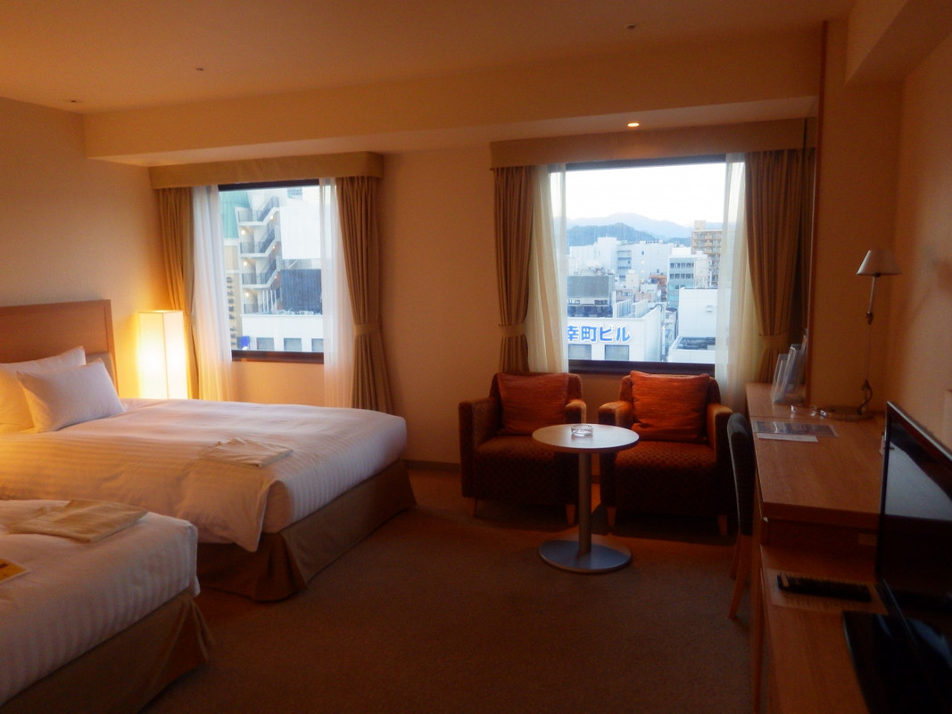 静岡駅前、立地は最高です。客室は広く、テーブルや棚が多くて、使い勝手がよかったです。