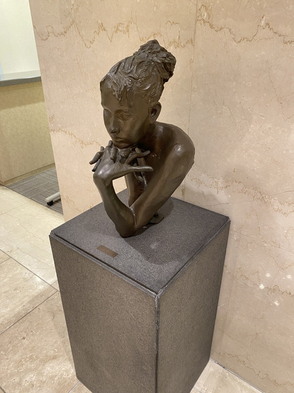 車寄せのある入口から入るとティーラウンジなどもあって大きめのホテルです。結婚式会場もあるんですね。フロントの左手に朝倉響子さんの作品がありました。フロントの向かいにずっと歩いて行くとキャッシャーの側にもう一体、朝倉響子さんの作品を見つけました。その途中にあるエスカレーター横にも彫像がありましたがこちらは他の方の作品でした。