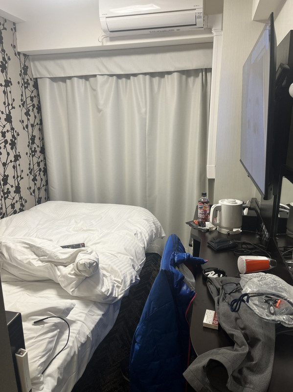 雨の日でしたが地下鉄の駅からすぐだったので濡れずにたどり着くことができました。部屋は狭く感じ、特にベッドと机の間が狭くて仕事をするような人は大変だろうなと思います。私は寝るだけだったのでそれほどの問題ではなかったです。このホテルを選んだのは大浴場があるということ。大きなお風呂に浸かりのんびりできたのは良かったです。