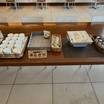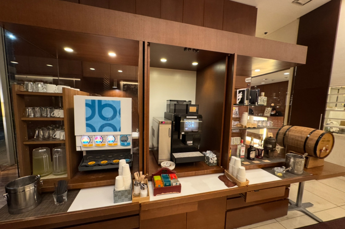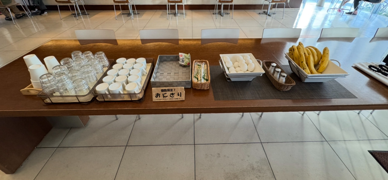 チェックイン後は、1階フロアにてソフトドリンク・アルコール・つまみのサービスがありました。朝食は無料で付いていますが、パンやおにぎりが中心で品数は少なめでした。