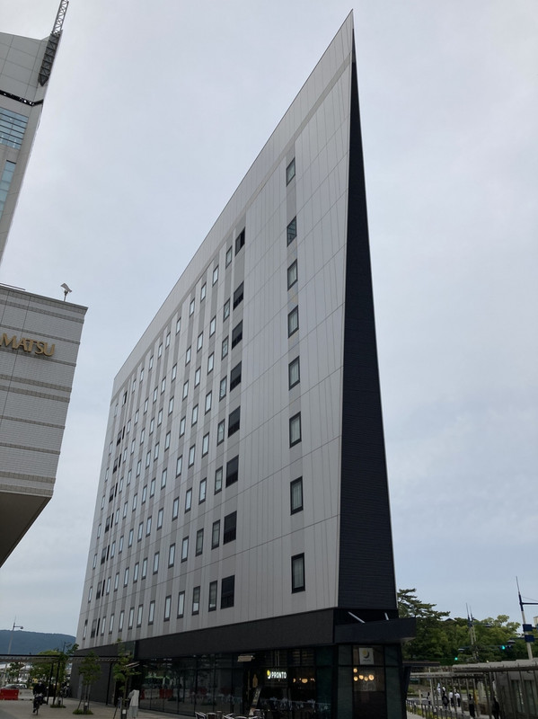 JR高松駅前にあるJR四国グループが運営するビジネスホテル。旧高松駅の宇高連絡船の桟橋付近にあり、JRホテルクレメント高松の隣接(停留所のある)しているので空港バスからのアクセスも良い。サンポート高松に位置することを意識してか、船の形をした三角形の奇抜なデザインのホテルではあるが、建物以外はシンプル。ただ、フロントは2階にありエスカレーターがないのは残念。多分、広さの関係だと思うが、エレベーターを待つことを考えるとこの点はマイナス。フロントは大きくはないが、多くのJR系のホテルと同じく、支払いやルームキーの受取は機械式なので、あまり時間はかからない印象。ロビーにはソファやコーヒーマシーンも用意されており、一定のサービスレベルを維持しています。また、郷土名産品も展示されています。
