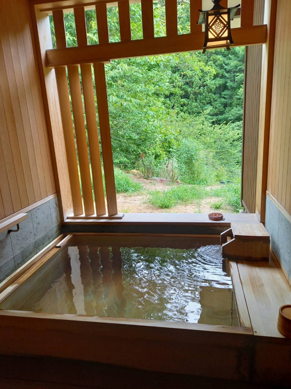 部屋はトリプル仕様で少々手狭に感じ、部屋風呂が温泉なのは嬉しいが、浴槽は小さい。 窓を開けても眺望はなく、小さな坪庭越しに廊下が見える。