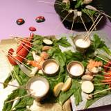 名物である夕飯のツバキフォンデュ(椿油の天ぷら)は楽しく美味しかったです。明日葉にうすーく衣付けてカラッと揚げるのが美味しかった。1 / 2