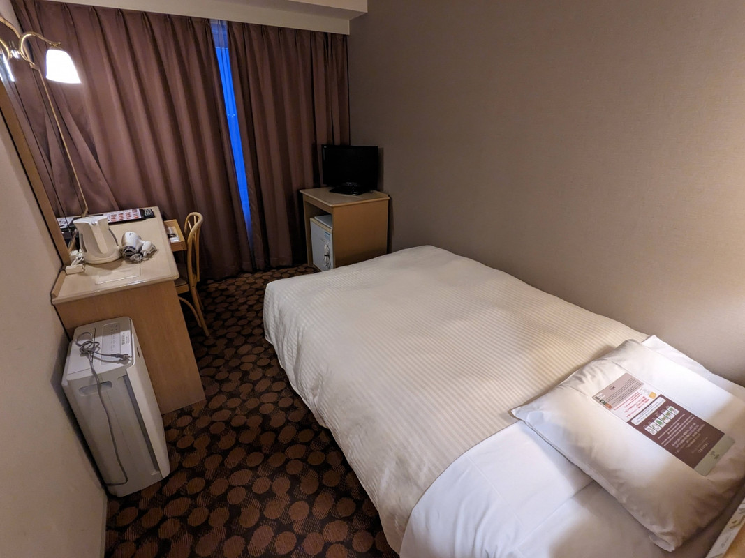 フロントさんも普通な感じで、田舎のビジホだなあと。目の前は福井城跡です。1 / 6