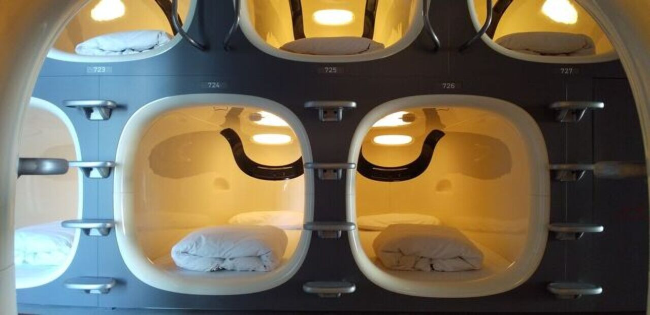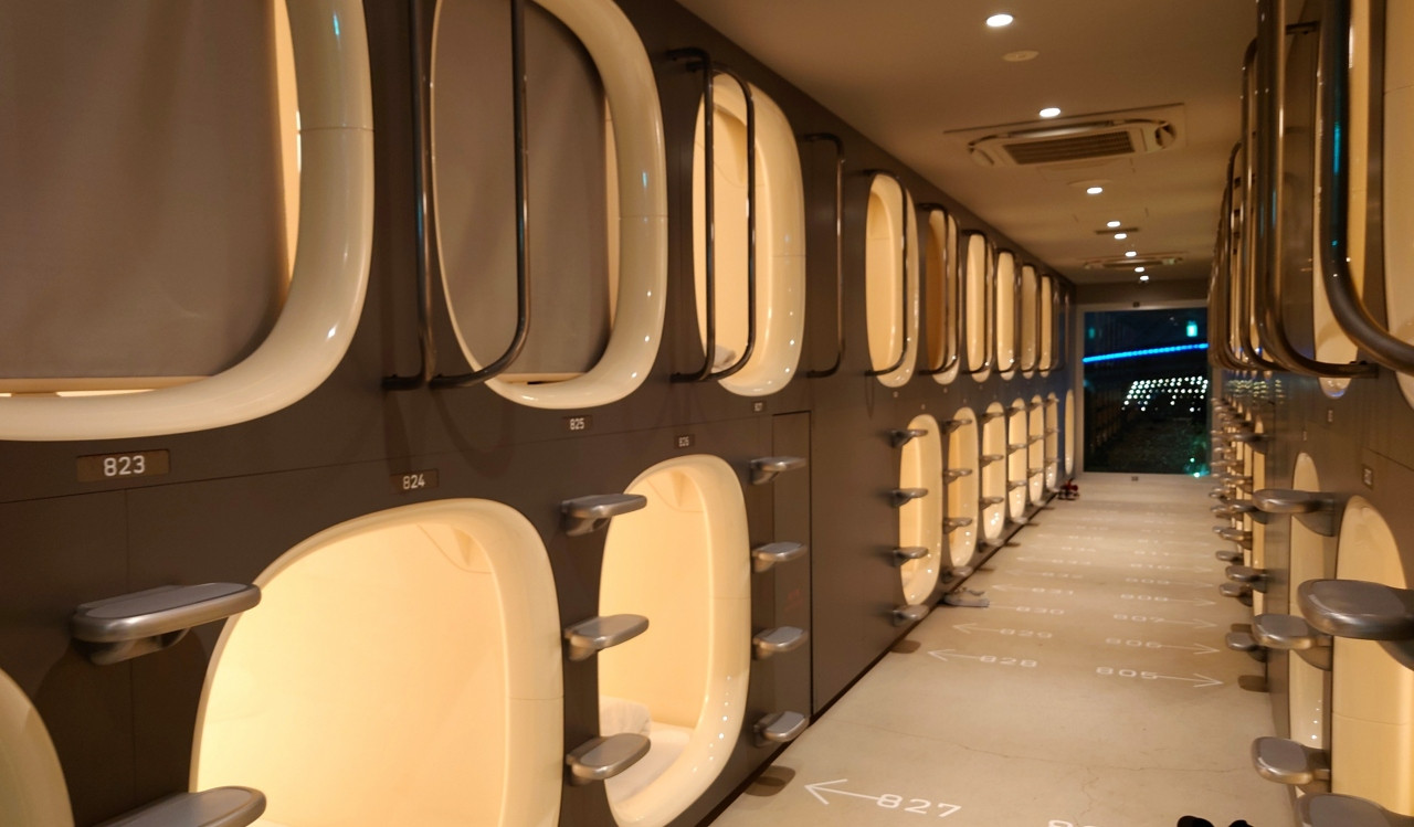 未来的なデザインと夜景。リーズナブルなカプセルホテル