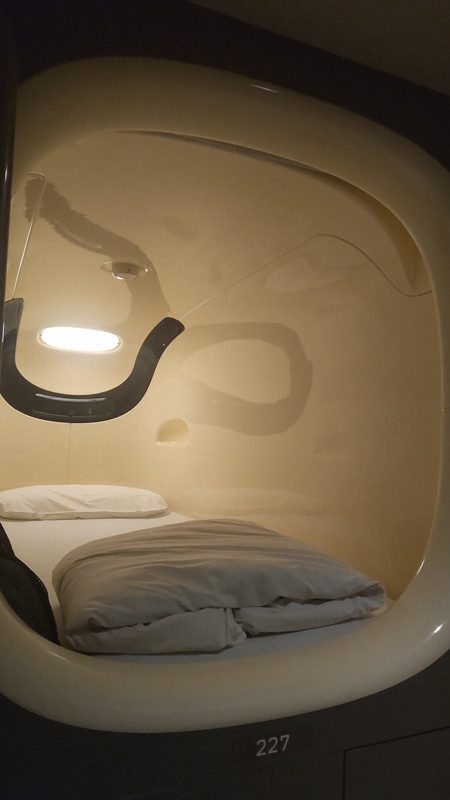 宿泊者にはフロントでタオル類と使い捨てスリッパが渡され、ロッカーとカプセルがあてがわれる。ロッカーのある階にシャワー、トイレ、洗面所などがあり、飲食は6階のラウンジでのみ可。カプセルはコンセントがあるだけで、テレビや目覚ましなどはなく、少しでも音を立ててはならないような雰囲気で、ひたすら寝るだけの場所になる。フロント、ロッカー、カプセル、ラウンジを行き来するエレベーターは1機しかなく少々不便。セコイことを言うようだが、歯ブラシが宿泊1日につき1本、使い捨てカミソリが有料なのは不満だった。1 / 3
