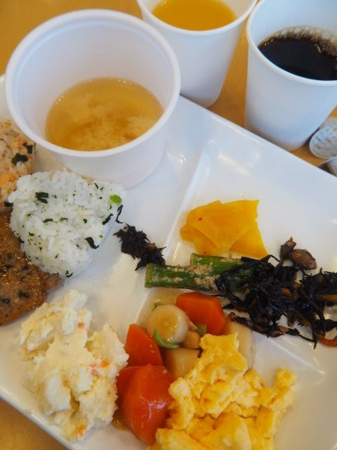 朝食では、おにぎり、卵焼き、ハンバーグ、煮っころがし、味噌汁、昆布、パン、オレンジジュース、コーヒーが提供された。1 / 3
