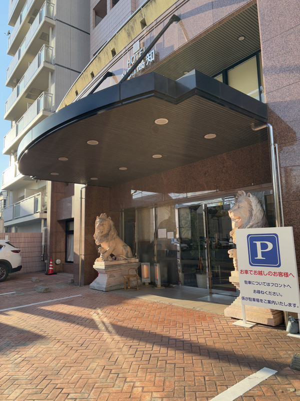 本館と別館が向かい合わせで立っており、どちらも入口のライオンが目印。マンションをホテルに改造したものかと思われます。故に新しくはないけれど価格が押さえられているのと大浴場があるので選びました。