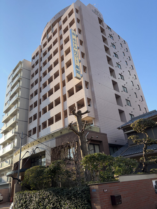 JR高知駅から徒歩で15分くらいの住宅街の一角にあるホテルです。観光スポットの高知城、ひろめ市場などにも気軽に徒歩で行ける場所です。普通のビジネスホテルで、こじんまりとしたお部屋ですけれど、必要な備品などは揃っているので問題ありません。清掃の状況もOKです。特に特徴はありませんですけれど、フロントのスタッフの方の対応は良かったです。チェックイン時間より2時間くらい早く到着しましたが、他のスタッフの方に連絡をして下さって、5分待ちくらいでお部屋に案内して下さったのです。屋上エリアに露天風呂みたいな大浴場があるのもいいですね。高知エリアも混雑しているみたいで、一泊8000円くらいの宿泊料金でした。