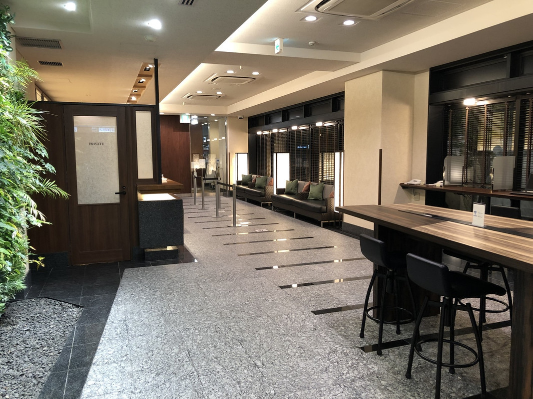 入口はマンシャンのような感じで高級感はありませんが、すぐにチェックインカウンターがあり、奥にエレベーターやコーヒーメーカーとウォーターサーバーがあったりと動線が考慮されていて機能的。ただ、チェックインカウンターの反対側にはソファがありますが、やや使いにくいかも。
