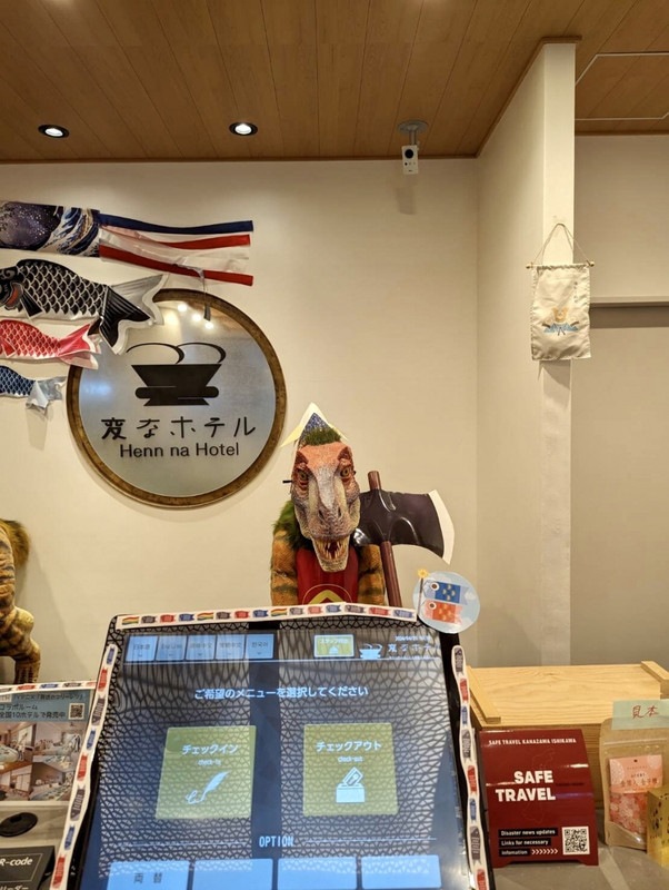 本日の宿泊予定のホテル名をカーナビに入力しようと聞いたとところ、「変なホテル」?更にフロントに行くと、ジョークか?恐竜が接客!?このホテルは香林坊にある新しめのホテルで、部屋は、ちょっと狭いが、とても清潔感があり、バス・トイレ別の造りで、快適に過ごせた。結局、チェックインからチェックアウトまで恐竜以外に会うことは無かったが、何故かほっこりした気分に。