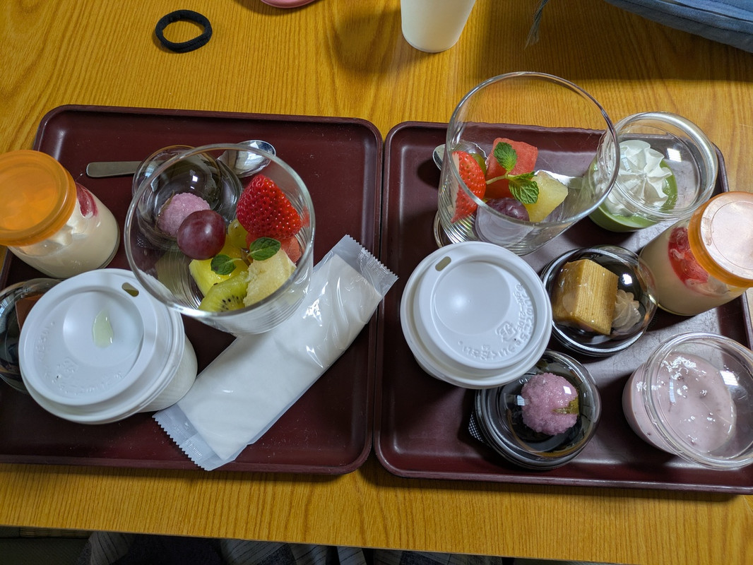 今回は2回目。バイキングで品数も多いがそんなに食べれない。今回デザートは部屋に持ち帰れる様になっていて食堂では食べれない。良いのか悪いのか。大好きなフルーツ、スイカやメロンが沢山食べれたのは個人的には嬉しかった。部屋からと露天風呂からの眺めは気に入ってる。ウェルカムドリンクや夜食の焼き芋とか色々工夫はされてるが、休暇村会員で14000円。余り安くは無いと思う。