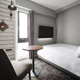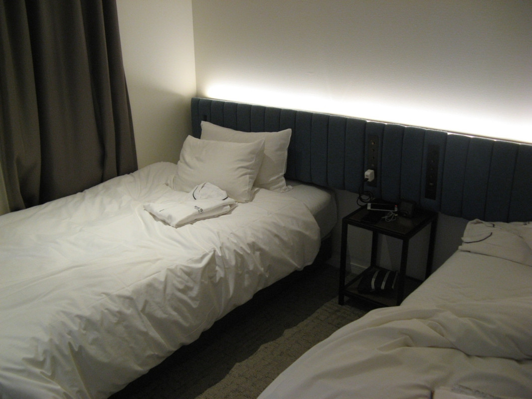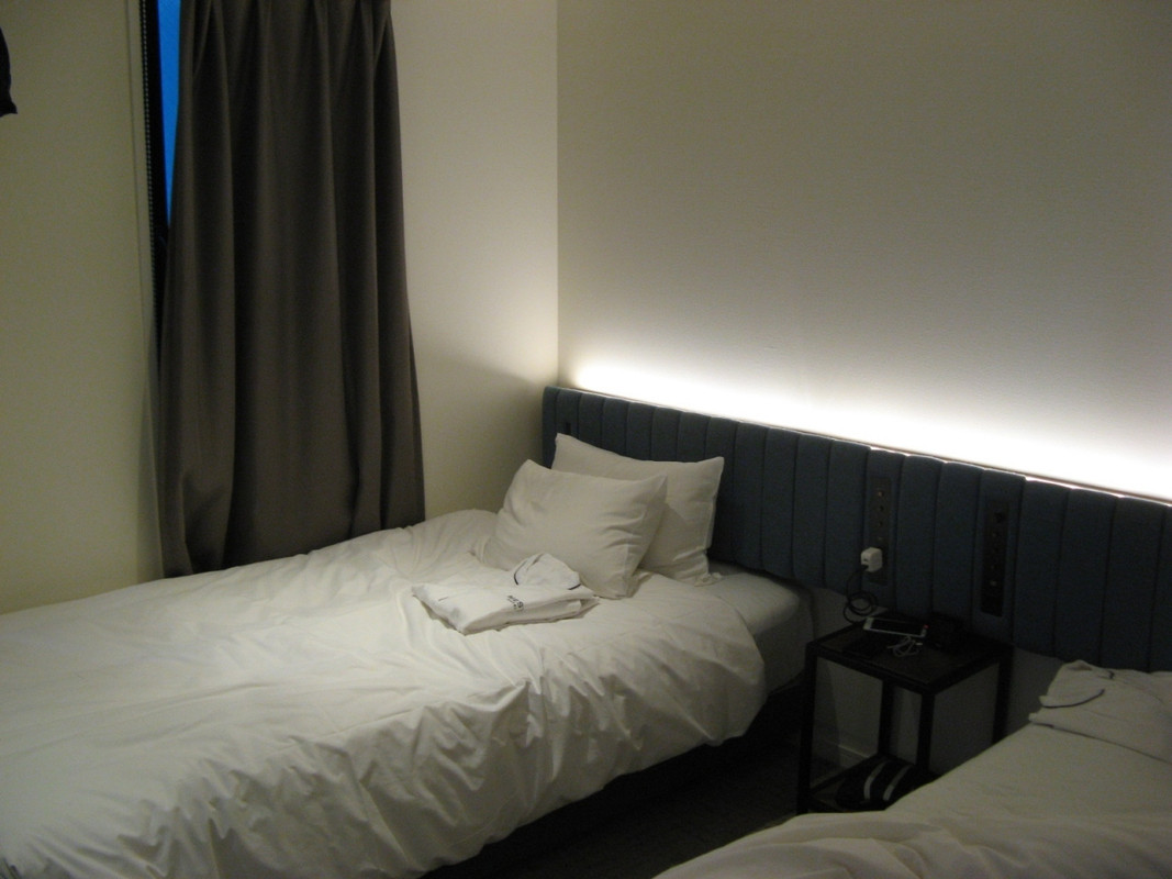 路面電車の胡町駅のすぐ前に位置し、八丁堀の繁華街にも便利な場所です。ツインの部屋に宿泊しました。とてもコンパクトな造りでユニットバスや椅子、テーブルは小さめで、冷蔵庫やケトルなど最小限の設備は揃っていました。朝食はコーヒーと共に小さなパンが三種類セットにした袋で提供され、部屋に持って帰って頂きました。