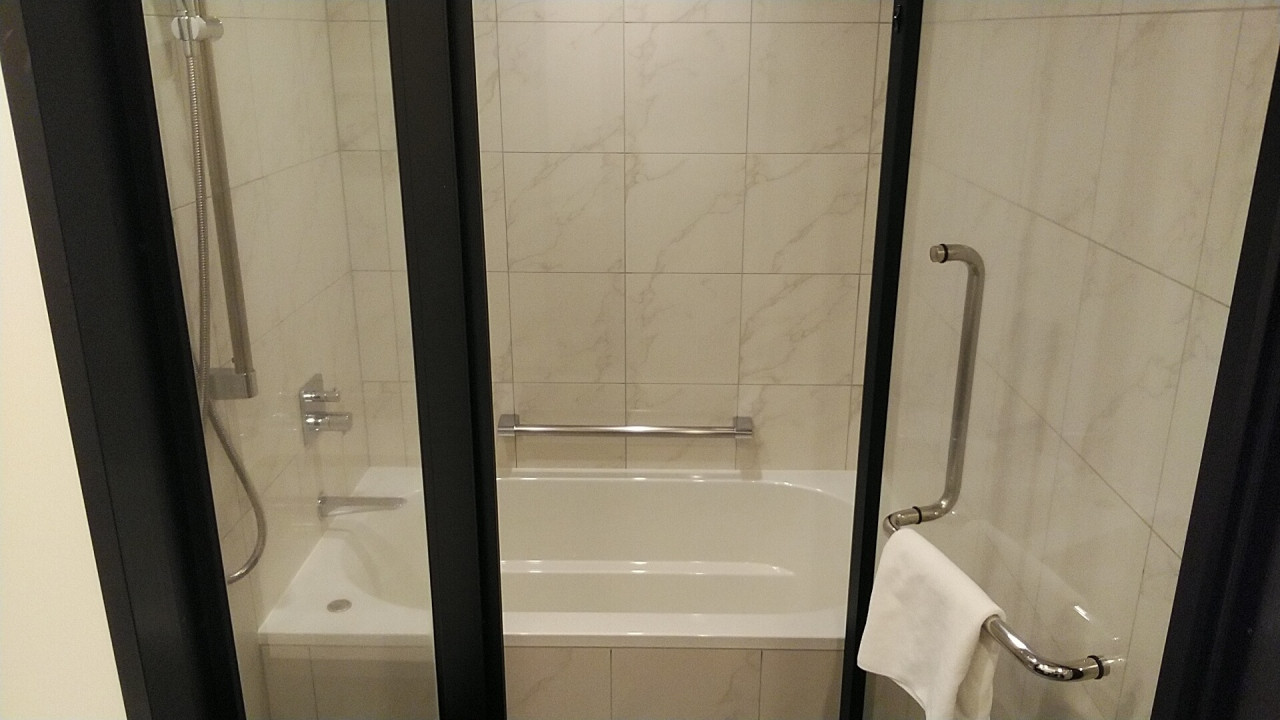 バスルームは完全セパレートで、洗い場も広く今どきのレインシャワーもあり。アメニティも歯ブラシやボディタオルはいいけど、剃刀はあまりよくない。