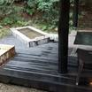 この囲炉裏で焼きいもを作っていただきましたけど。居間の向こうに洗面所・トイレ・室内風呂があり、その奥に岩盤浴室があります。 庭には源泉掛け流しの露天風呂、そこから湯が流れ出て寝湯に繋がっています。