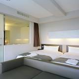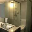 低層階の海側のシングル部屋は、ガラス張りのシャワーブースとトイレ、トイレの前にベッド。