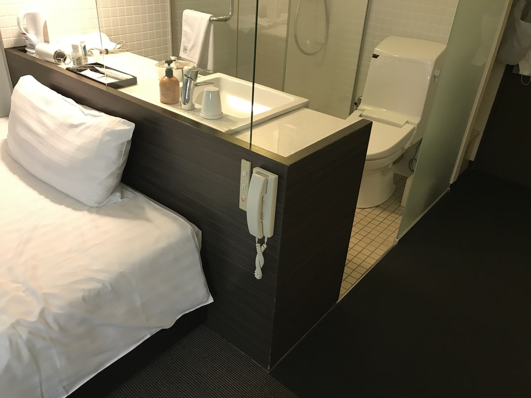 部屋の作りはすごく特徴的。ベット枕後は仕切りなくトイレと洗面台。洗面台の鏡が僅かに仕切り代わり。1 / 2