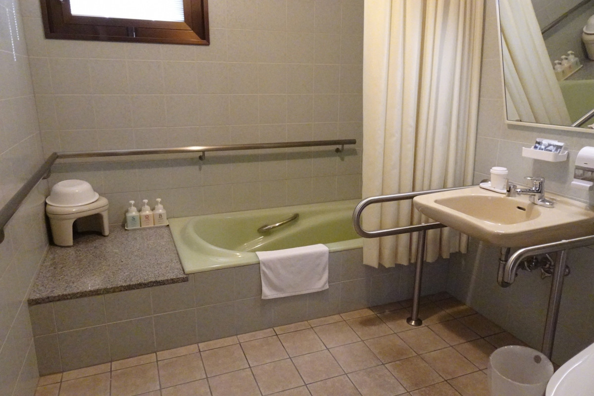 建物は少し歴史を感じます。お部屋は、たまたま泊まったお部屋がバリアフリーに特化したお部屋だったのか、介護施設のような洗面所とお風呂でした。