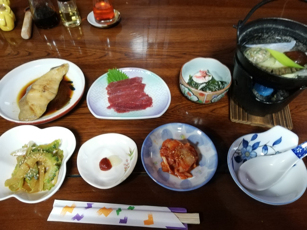 温泉民宿 赤ひげは、 湯野上温泉の 中心街よりやや北へ1 km ほど登ったところに存在いたします。 確かに民宿と言われていますが、 おもてなしはとてもよく温泉も源泉かけ流しほぼ24時間入浴可能である。 食事も家庭料理風であるが味も良くボリュームもあって私は好きである。 温泉は無味無臭やや鉱物臭のする透明なしっかりとした 混じり気のない 源泉である。 温泉の温度が非常に高く、このまま源泉を注いでしまうととてもではないが熱く入れないので やや水で薄めながら入浴することとなってしまった。 自由に湯加減を操作するのもなかなか楽しい。 湯船は大人二人が入ると いっぱいいっぱいなのでタイミングよく さっさと入ってさっさと出ると言う 次の人の事も考えながら やるのがよいであろう。 ここもまた来てみたいと思う名宿である。 この時期一人で泊まっても一泊1万円を切るのはなかなかない。