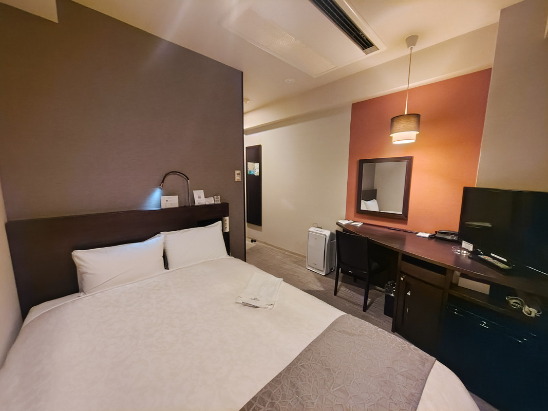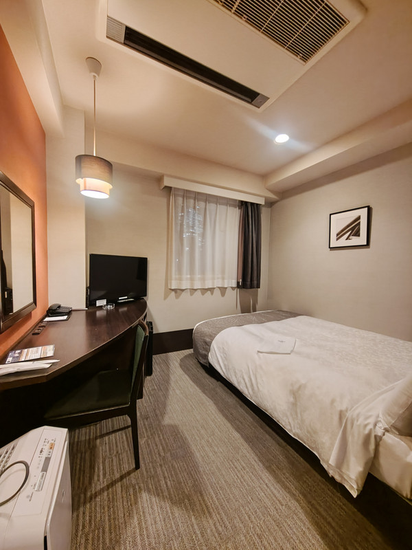 JR名古屋駅の桜通り口から見て大名古屋ビルヂングの裏手200m位の所にある名鉄系のホテルです。元旦に寝るだけだったのでコンパクトツインの部屋に1泊しました。名前の通り非常にコンパクトな部屋で、別途は幅の狭いシングルベットが隙間なく並べられており、殆どダブルベットと同じ感じでした。そのベットも何故か一つは傾いてました。