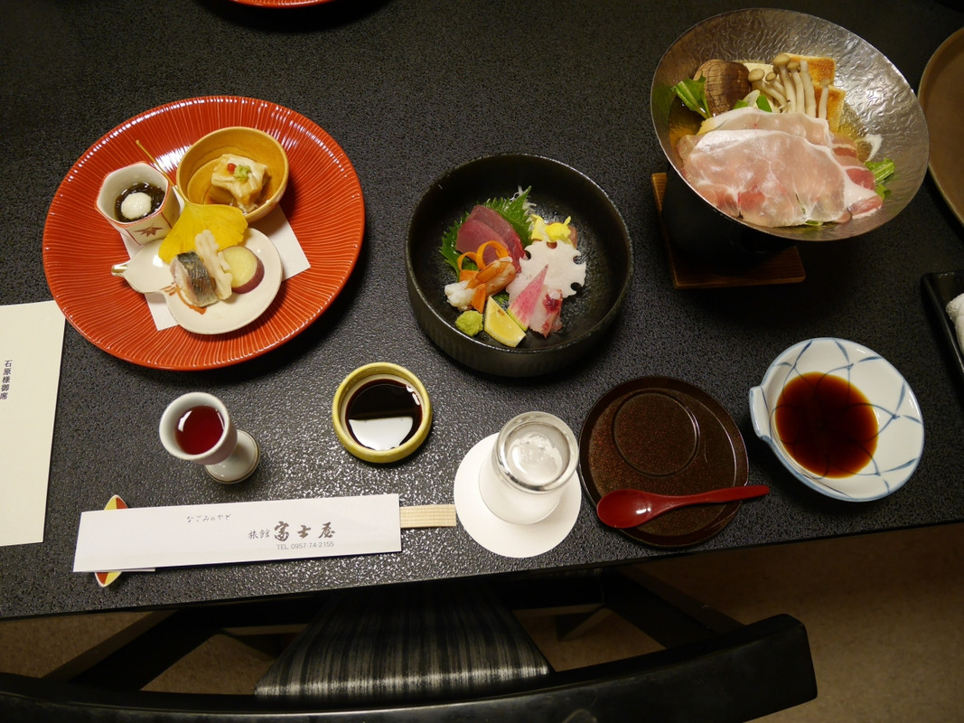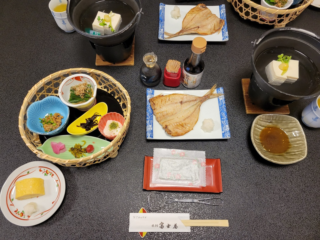 夕食は十分な品ぞろえ、朝食はいわゆる旅館のフツーの朝ごはんと言う感じでした。