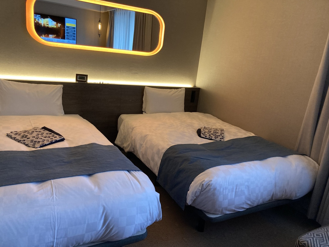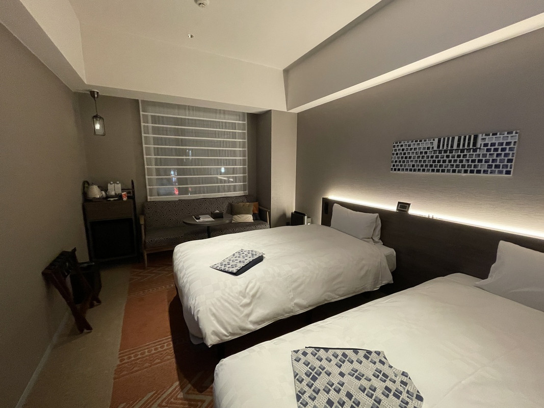 内装はミッドセンチュリー風。客室のベッドスローやクッションなどには、倉敷帆布が使われています。浴室などの水回りが大変使いやすく、快適な滞在でした。