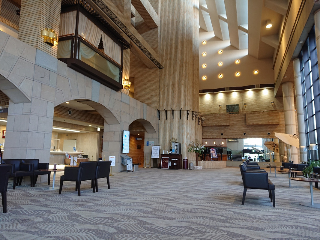 海辺の大きなホテル。周辺には体育館やプールなど、ちょっとしたリゾート地になっています。シーズンオフの2月の土曜日、しかも緊急事態宣言発令中ということもあってか、ガラーンとしていました。ゴージャス&ラグジュアリーなホテルという感じです。