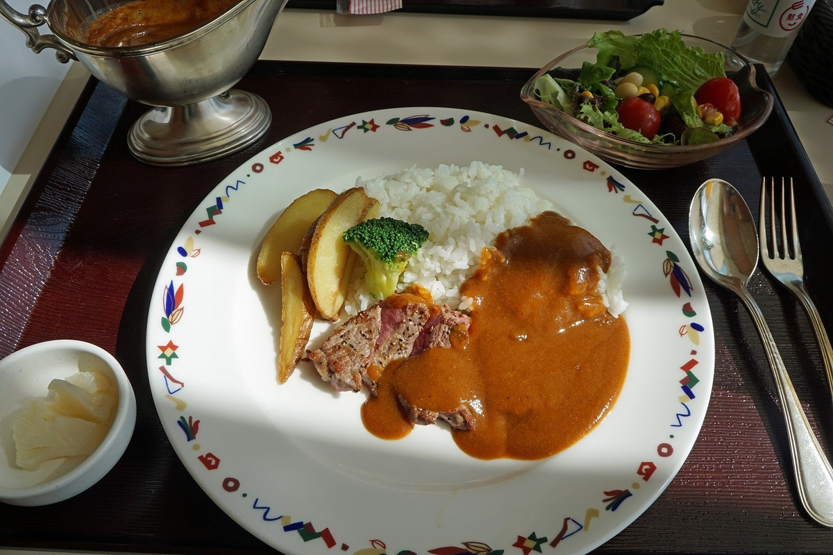 ツアーで釧路から美幌峠へ行った帰りにこのホテルで昼食になりました。ホテルのHPには昼間のレストラン営業の案内が無いので不思議に思っていたのですが、ツアーの参加者のためにオープンしていたようです。今回釧路プリンスに9泊するので旅行会社とホテルでいろいろ提携しているようでした。希望者は屈斜路湖プリンスに1泊して津別峠で星空を見るとか、早朝に雲海を見るなどのツアーも開催されていました。1泊2食で12,000円と格安でしたが、翌日は摩周駅から自力で帰らないとならないので参加しませんでした。ランチは10名ほどで大きなレストランを貸し切りでしたが、天井の高いウッド調の明るい気持ちの良い内装でした。メニューは3種類で、摩周そばと海鮮丼のセットとザンギ丼とビーフステーキカレーでしたが、迷わずビーフステーキカレーにしました。プリンスホテルのカレーは美味しいのですが、それに柔らかいステーキが付いて1,500円(税さ込み)ですから。ビールも中瓶が800円ほどと安かったです。食後は湖畔の風景を楽しんだり、クッシーを探してみたり。ホテルの前に広がる芝生のガーデンも気持ちよく、ピラミッドアジサイなどきれいな花がきれいに咲いていました。ガーデニング専門のスタッフがいるとのことでした。また、グランピングの施設もあり、芝生に白いテントがきれいでした。ここで数時間ゆっくりして、1泊しても良かったかなと思いました。