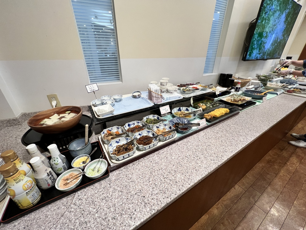 朝食ブッフェの一例。和食主体のおかずが豊富で味もよし!