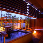 客室の露天風呂は、夜になると庭園灯が光ります。その灯りが優しく幻想的。湯量たっぷりの温泉を独り占めして、ゆったりリラックス。