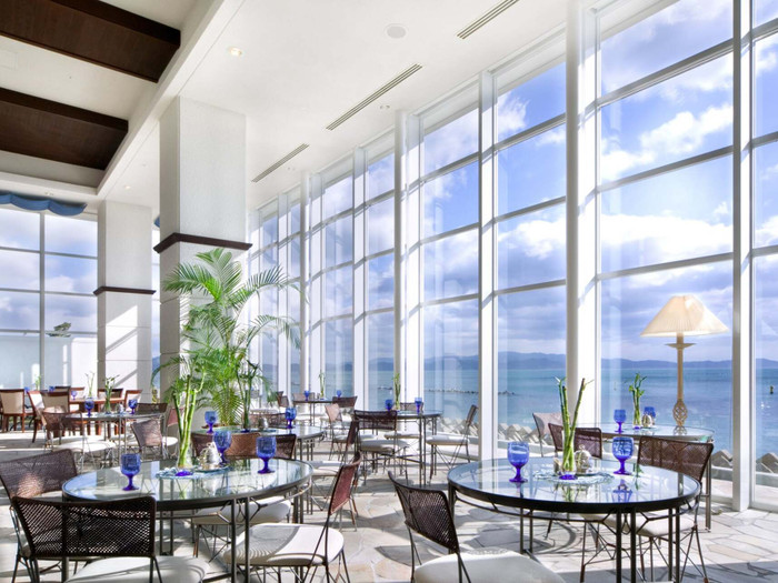 友だちとの旅には欠かせないスイーツも、徳島の絶景が見られる素敵なカフェで♪「テラスカフェ オーゲ」は、鳴門海峡からもほど近いリゾートホテル「アオアヲ ナルト リゾート」内のカフェ。天井から床まである大きな窓の向こうには一面に海が広がり、足を踏み入れた瞬間思わず感動……!渦潮を見たあとは、徳島名産のさつまいも“鳴門金時”を使ったスイーツをいただきながらきらめく海を眺めてひと休みしませんか?