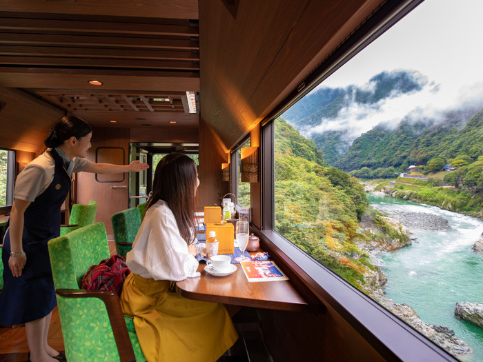 「四国まんなか千年ものがたり」は、全席が吉野川の絶景が楽しめる特等席。ホテルのラウンジのようなシックなソファ席に座れば、自然が織りなす絵画のような景色をひとり占めすることができます。友だち同士で横に並んで座れる席もあるので、好みに合わせて選んでみて。