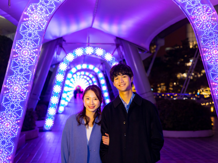 全長約140mの光の回廊「ミルキーウェイ」は、端から見るとその奥行きに吸い込まれそう……。そのままワープできそうな不思議な美しさを、ぜひ大切な人と共有してみて。