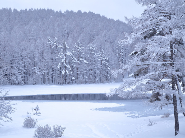 ホテルから車で20分ほど行くと、農業用の池として作られた「御射鹿池(みしゃかいけ)」が。雪をまとったカラマツが池の周りに立ち並ぶ光景は、思わず息をのむほどの美しさです。周囲には雪質のよいスキー場もありますよ。