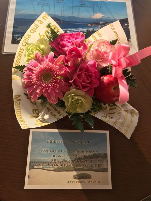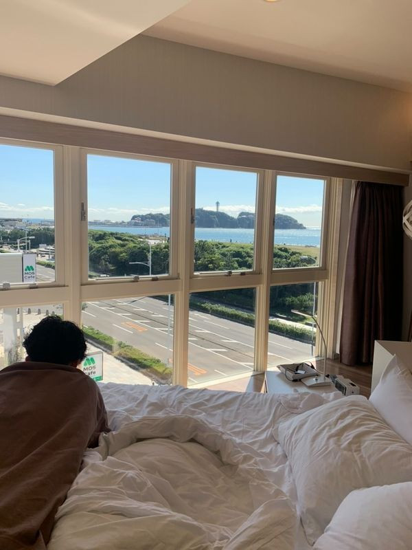 事前のやり取りの中で彼の誕生日と伝えていたのですが、サプライズで部屋にお花が置いてありました。お心遣いがとても嬉しかったです。近くの七里ヶ浜で夕陽を眺めて写真を撮りました。かなり写真映えするロケーションだと思います。朝食は品数が多く、朝からお刺身やふわふわのオムレツを頂けたのが嬉しかったです!お部屋の大きな窓から朝の海を眺めて過ごしました。晴れた日はブルーの空と海が本当に綺麗です!